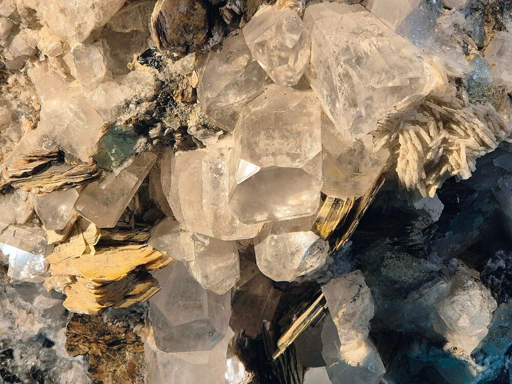 Achat Achat Achat Achat Almandin Amethyst Beryll Calcit Calcit Hämatit Kalkspat Malachit Muskovit Pyrit Quarz Quarz und Kalkspat Quarz Quarzdruse Quarz Quarz